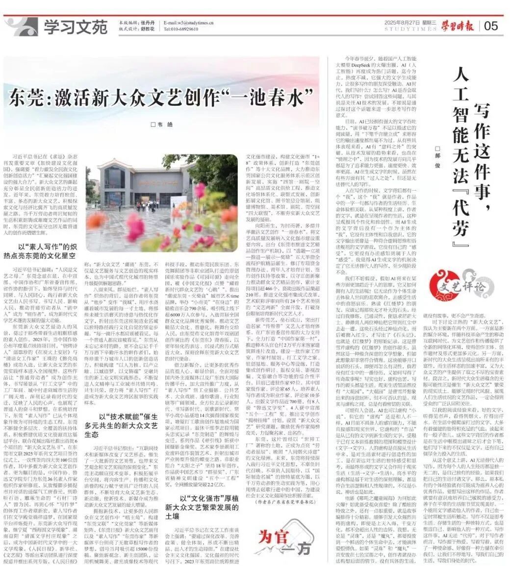 其实,这一系列实践与思考,早就体现在城市主政者的系统论述中。8月27日,东莞市委书记韦皓在《学习时报》发表署名文章——《东莞:激活新大众文艺创作“一池春水”》,将新大众文艺实践置于城市发展战略高度。文章指出,东莞“着力培育独创、丰富、多态的新大众文艺”,让普通劳动者从“剧中人”成为“剧作者”,这是践行以人民为中心的发展思想、探索文化与经济比翼齐飞的高质量发展之路。文章强调,“每一滴汗水都应该被看见,每一个普通人都应该被看见”。这篇文章不仅肯定了成绩,更从城市治理的角度,将新大众文艺的繁荣视为汇聚千万人口与城市深度融合、共生共荣的强大精神纽带,为“中国式现代化城市的转型升级提供解题思路”。